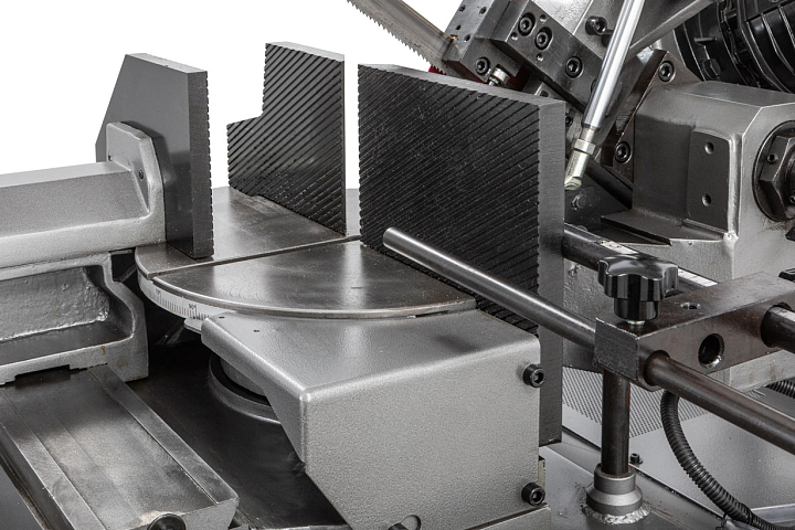 Модель MBS-1012DASP имеет регулируемую направляющую для регулировки прохода ленточного полотна в зависимости от формы заготовки и ее диаметра. Направляющие блоки осуществляют позиционирование полотна непосредственно под прямым углом к поверхности обрабатываемой заготовки. Максимальная стойкость ленточного полотна обеспечивается подачей СОЖ в зону резания.